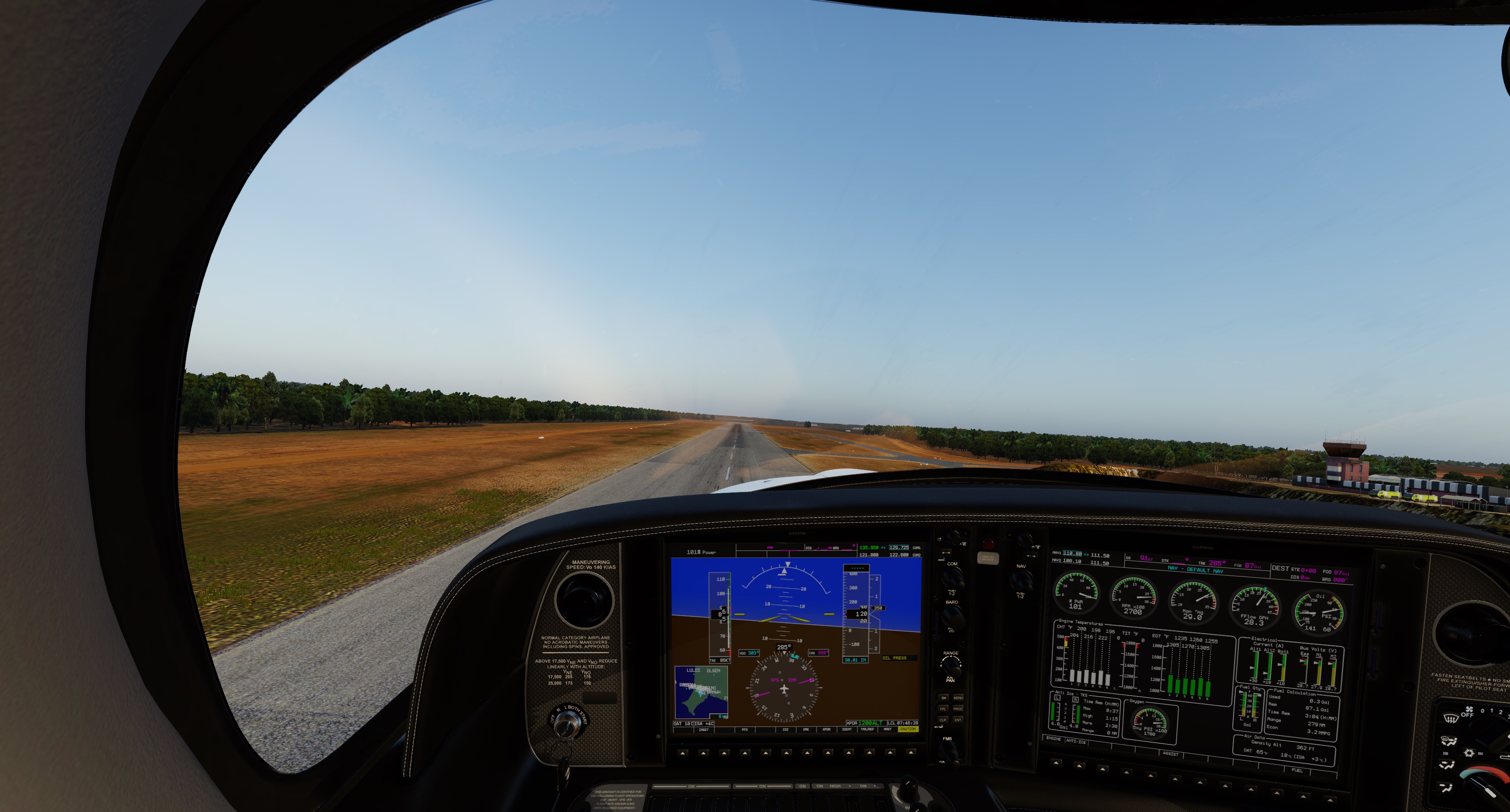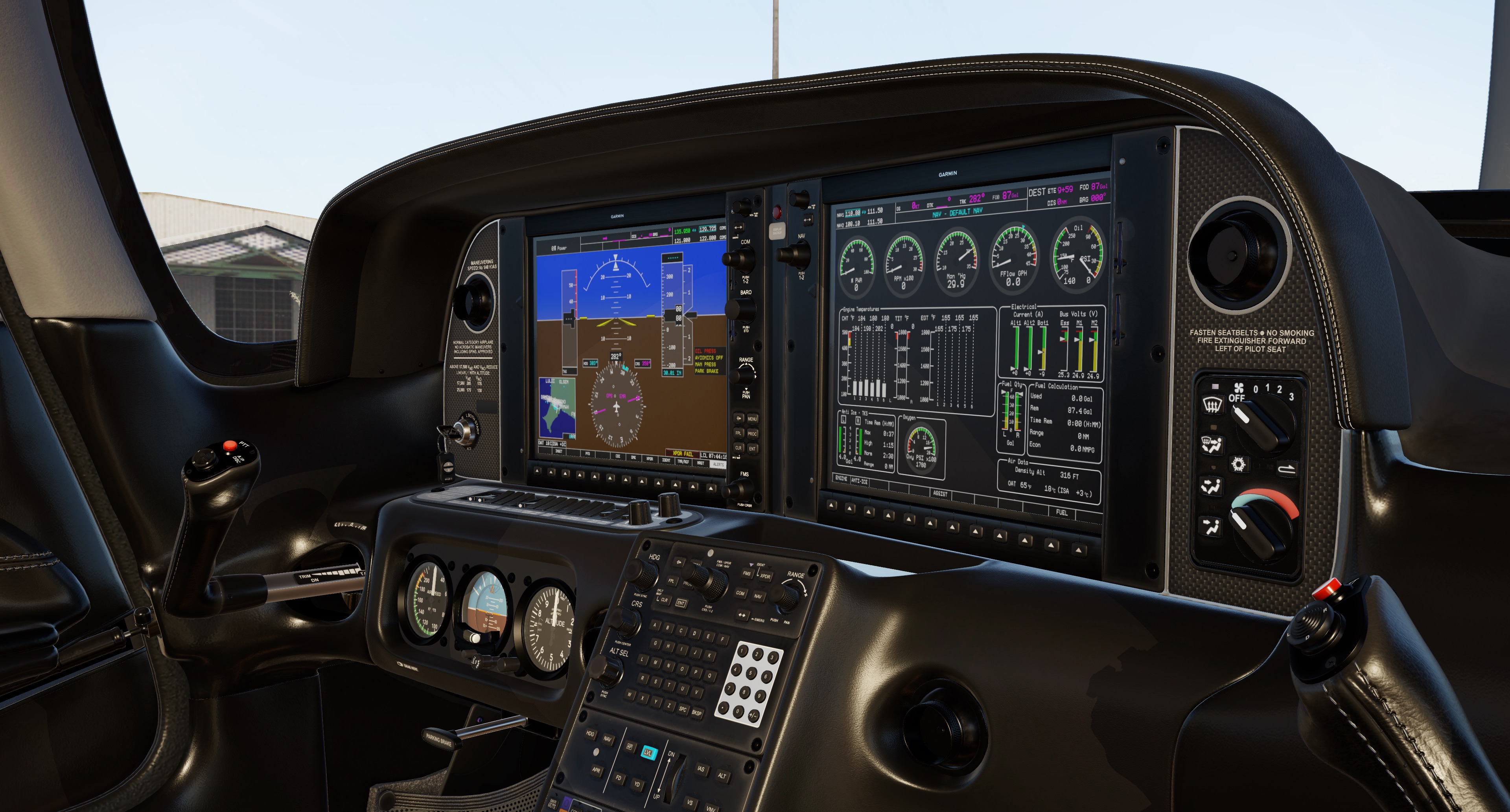 Significant work has gone to enhancing the Laminar G1000 to provide many of the functionalities in the G1000 Perspective suite. Synthetic Vision, as implemented in HotStart’s TBM900 and TorqueSim’s Pocket Rocket has been integrated. The engine pages and sidebar have been modeled fully to provide the necessary details for proper engine management. Lean-assist functionality has been integrating assisting in the proper leaning of the engine. Checklists have also been integrated onto the G1000 providing easy access to the necessary preflight, starting, in-flight, post-flight, and emergency procedures. In addition to these additions, numerous other tweaks were implemented including matching the Perspective’s Top-Bar details including % Power, and destination calculations, in addition to the integration of “Know your Limits” and the fuel calculator system (which we implemented as a custom interface for refueling the aircraft!). All these customizations are designed to also work perfectly with the RealSimGear G1000 and Perspective Package.