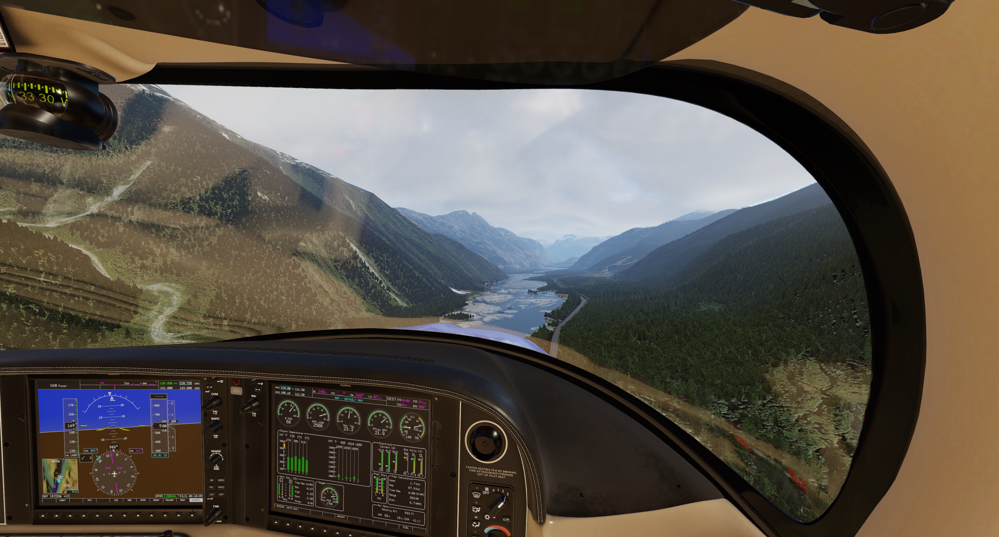Both the SR22 G3 and SR22TN G3 are simulated. The SR22 is equipped with a normally aspirated Continental IO-550-N capable of 310 HP, while the SR22TN models the Tornado Alley turbo normalizing system attached to the engine. The TorqueSim custom physics model is the most accurate simulation of a piston engine for X-Plane! The simulation models the mass flows of air and fuel through every part of the engine in real time. Air enters the engine through the air filter, flows through ducts, passes obstacles like the throttle plate, burns the fuel and leaves the engine as exhaust gas. Pressures and temperatures are calculated in every section independently, all contributing to the different segments of the simulation. With the Tornado Alley turbo-normalizing system installed, the full performance capability of the engine model comes into play, as compressors, intercoolers, wastegate and turbines also have their places in the calculation of air flows and pressures. All engine parameters are tuned against a huge database of real engine log data to ensure maximum possible accuracy in all phases of flight. The entire engine simulation runs on a separate thread from the main simulator. This allows for the timing necessary for proper simulation, independent of sim frame-rate, but also ensures that the model has a near-zero performance impact on the simulator!