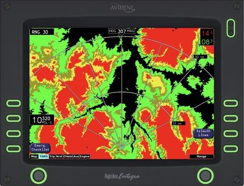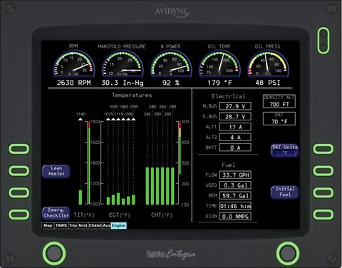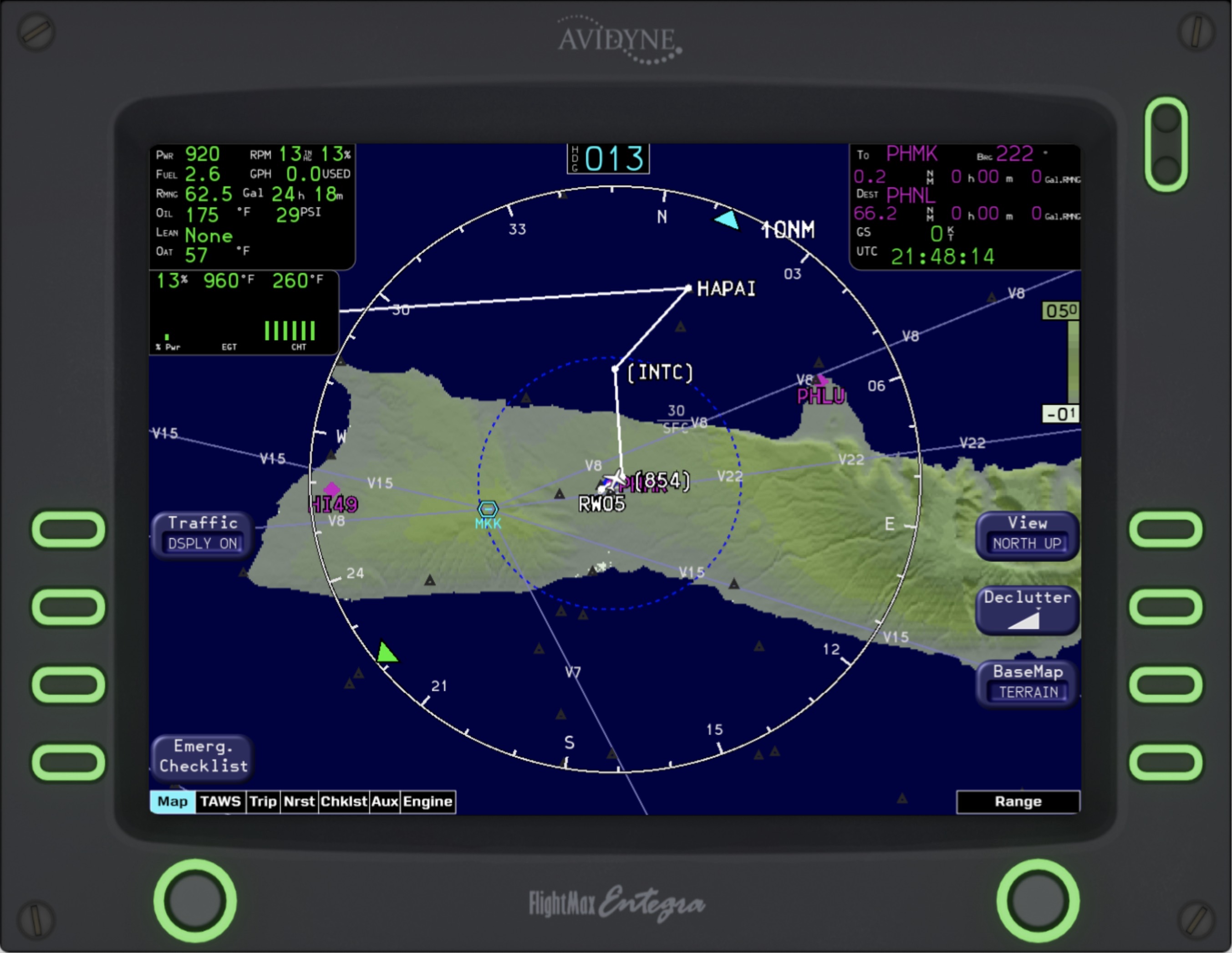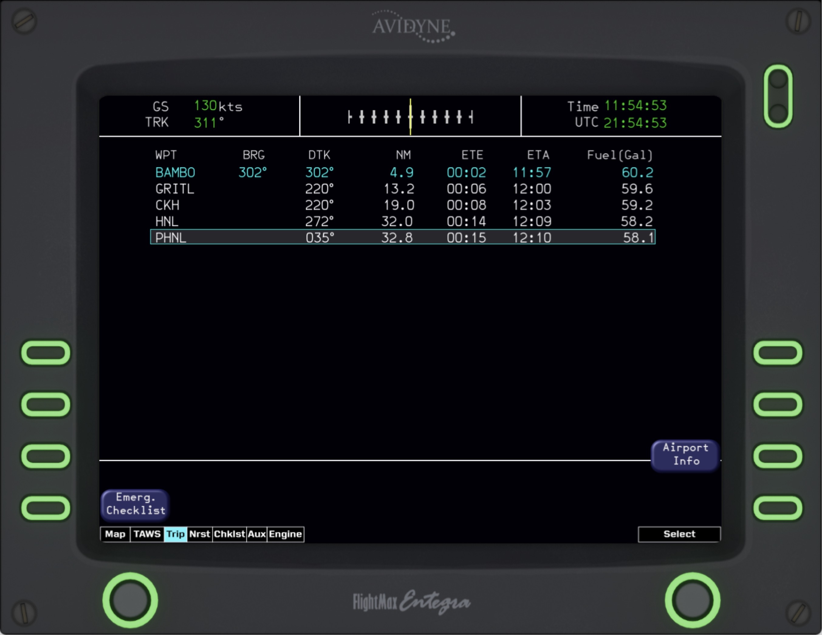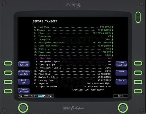 The Entegra MFD has many different distinct modes in which it operates. The main mode, “MAP” features a gorgeous terrain rendering system. This is based on a short-term caching tiling system to optimize performance. Tiles are regenerated on-the-fly throughout flight, on a separate thread from the simulator. Airports, runways, VORs, NDBs, FIXs, traffic, and the flight plan are all overlaid on top of the terrain base map. Engine indications, as well as a brief flight plan overview are also shown. The Terrain Awareness and Warning System (TAWS) depicts the terrain relative to the current altitude, indicating areas of terrain conflicts on a graduating scale. This helpful mode removes all irrelevant info and lets the pilot focus on safely navigating their aircraft around terrain. “TRIP” and “NRST” are very handy for knowing your flight plan and surroundings. The TRIP page shows your waypoints from the GPS and provides helpful details including the distance, ETA, and estimated fuel at each waypoint. The NRST page shows the nearest Airports, VORs, NDBs, and FIXs. There is also a detailed airport view that shows the runway layout, frequencies, and elevation! The checklists for the aircraft are also fully integrated into the MFD. The proper procedures for normal flight, emergencies, and system malfunctions can all be viewed and followed. Of course, the Entegra Engine page is also intricately modeled. It features custom gauges, Lean-assist functionality, and the ability to set the onboard fuel via the fuel-totalizer.