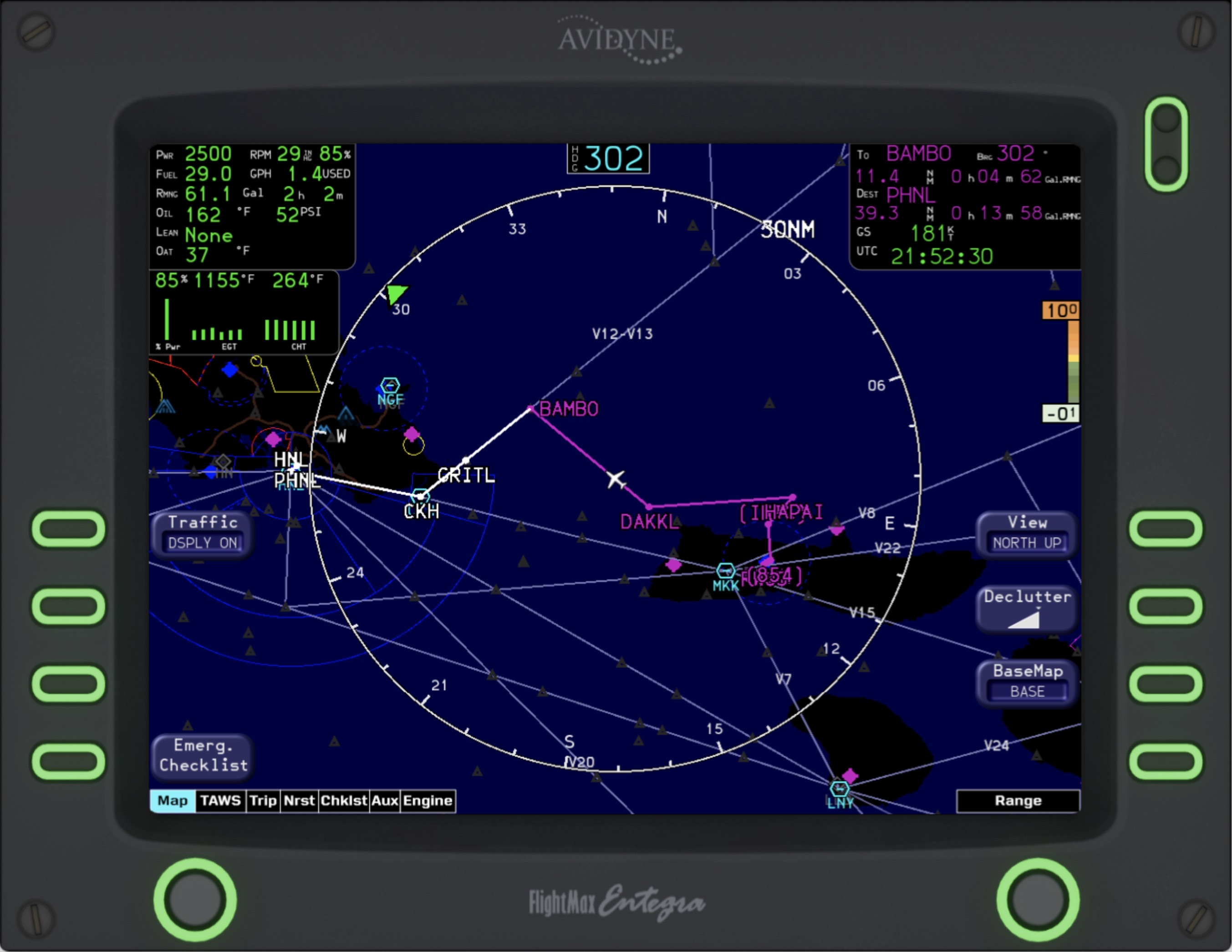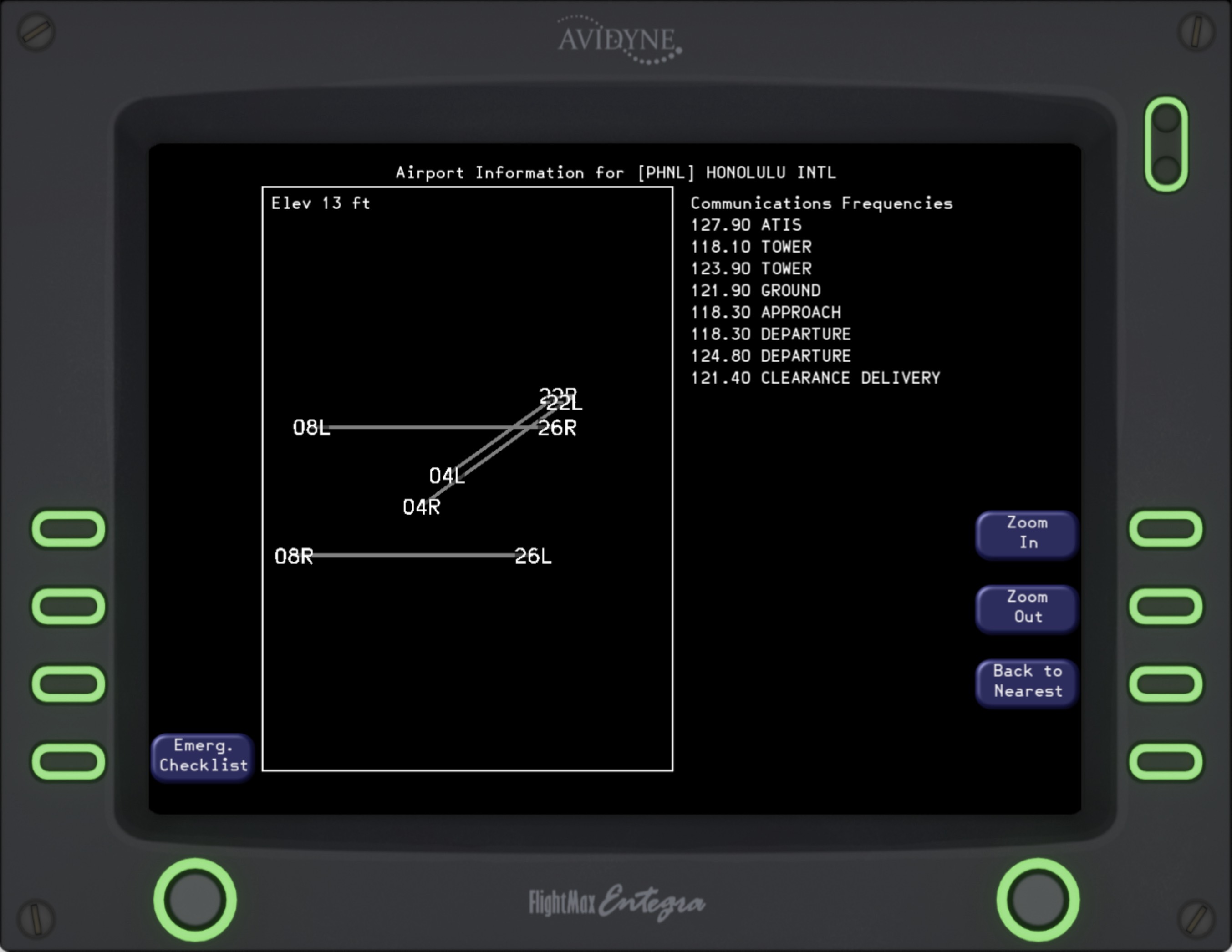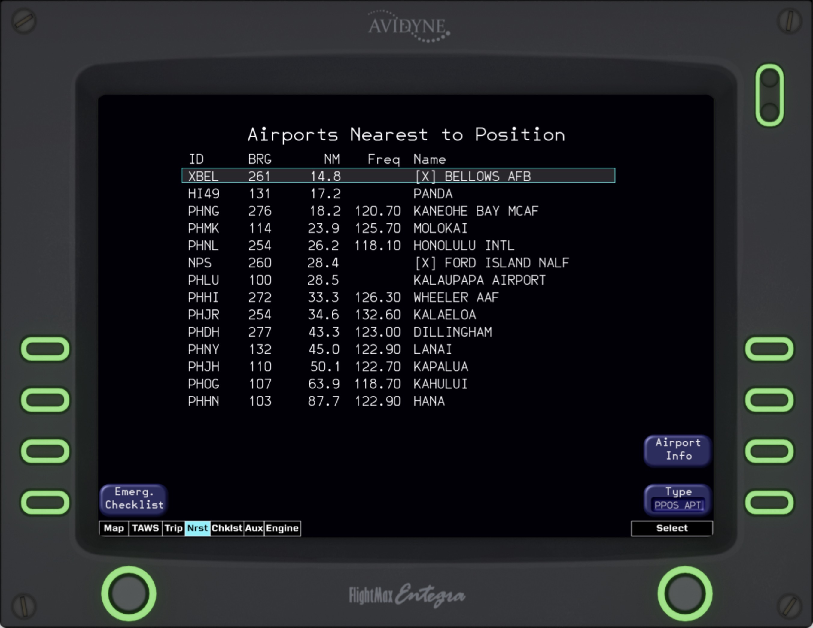 The Entegra MFD has many different distinct modes in which it operates. The main mode, “MAP” features a gorgeous terrain rendering system. This is based on a short-term caching tiling system to optimize performance. Tiles are regenerated on-the-fly throughout flight, on a separate thread from the simulator. Airports, runways, VORs, NDBs, FIXs, traffic, and the flight plan are all overlaid on top of the terrain base map. Engine indications, as well as a brief flight plan overview are also shown. The Terrain Awareness and Warning System (TAWS) depicts the terrain relative to the current altitude, indicating areas of terrain conflicts on a graduating scale. This helpful mode removes all irrelevant info and lets the pilot focus on safely navigating their aircraft around terrain. “TRIP” and “NRST” are very handy for knowing your flight plan and surroundings. The TRIP page shows your waypoints from the GPS and provides helpful details including the distance, ETA, and estimated fuel at each waypoint. The NRST page shows the nearest Airports, VORs, NDBs, and FIXs. There is also a detailed airport view that shows the runway layout, frequencies, and elevation! The checklists for the aircraft are also fully integrated into the MFD. The proper procedures for normal flight, emergencies, and system malfunctions can all be viewed and followed. Of course, the Entegra Engine page is also intricately modeled. It features custom gauges, Lean-assist functionality, and the ability to set the onboard fuel via the fuel-totalizer.