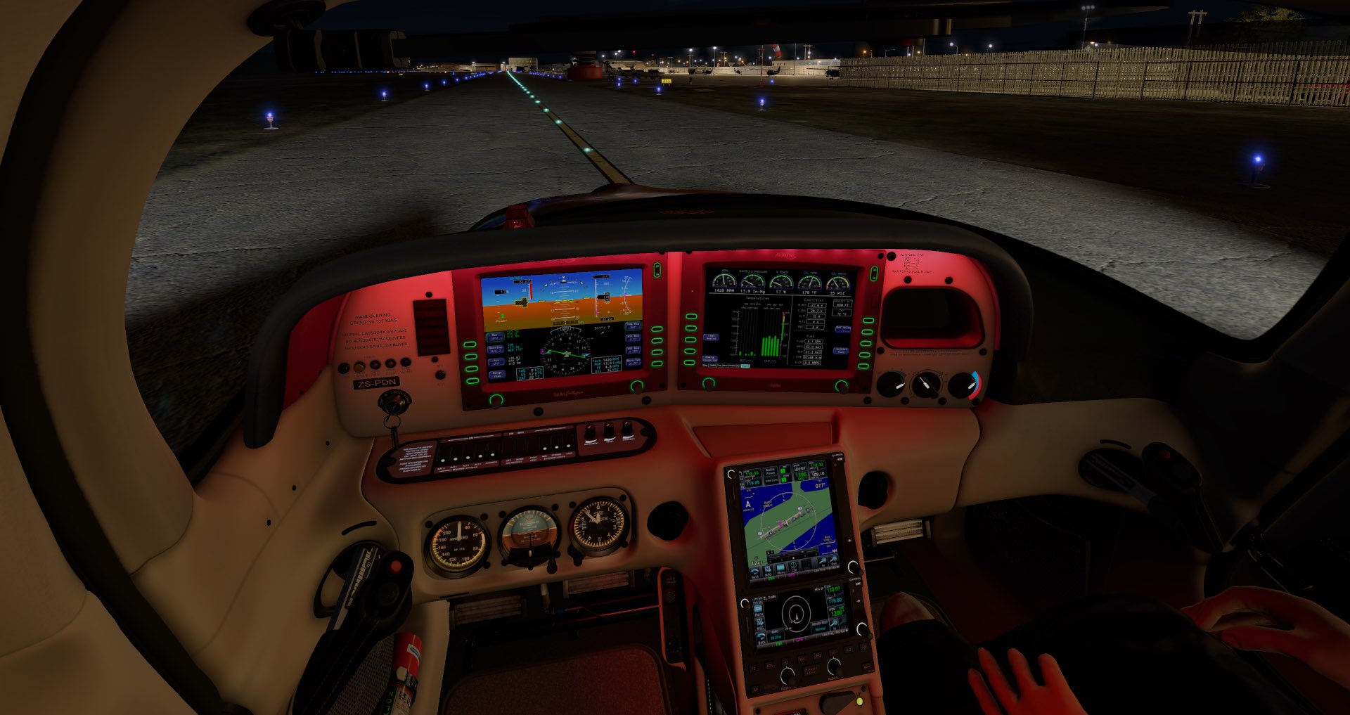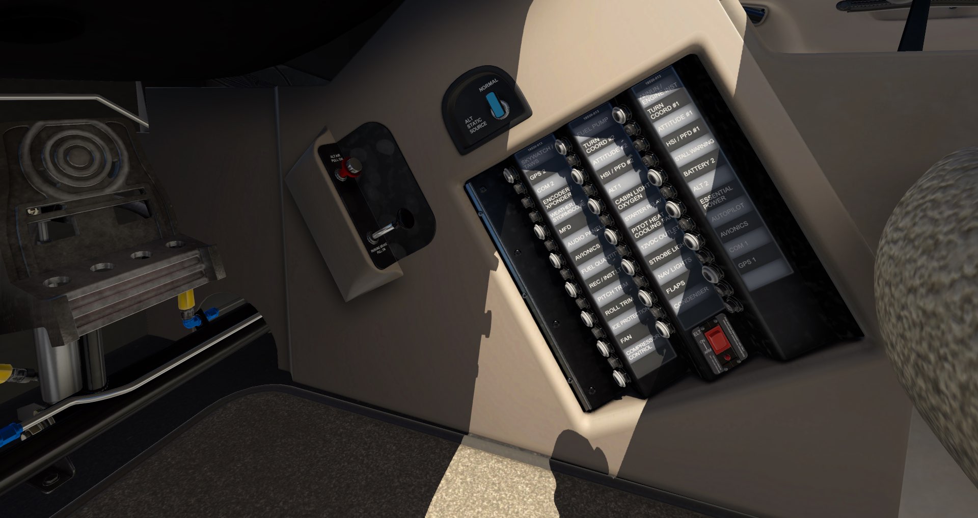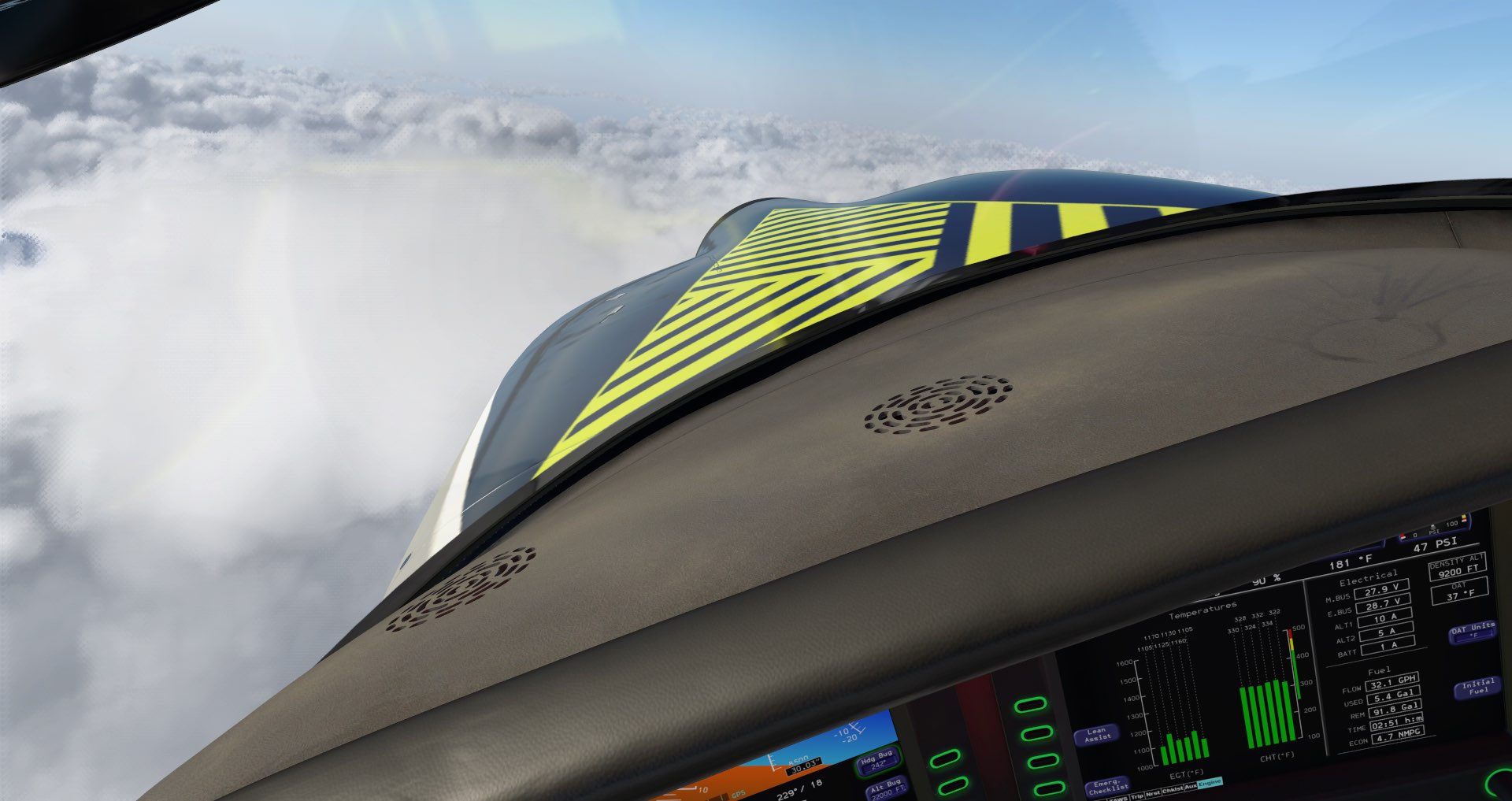The SR22 electrical system has also been intricately detailed, ensuring every last breaker and switch is modeled. The dual-batteries are simulated with a custom lead-acid battery simulation. The dual-alternator setup and Master Control Unit have been intricately tuned to interface with the rest of the simulation. All electrical busses and circuit breakers are individually simulated to provide for the most in-depth of simulation. All the intricacies of the SR22 electrical system including alternator drop at low RPM are modeled.